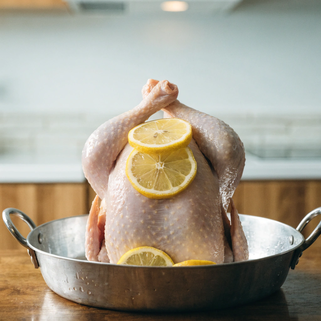 - Season the cavity with salt and pepper. Cut one lemon into quarters and place it inside the cavity along with the halved garlic cloves and 2–3 sprigs of rosemary.