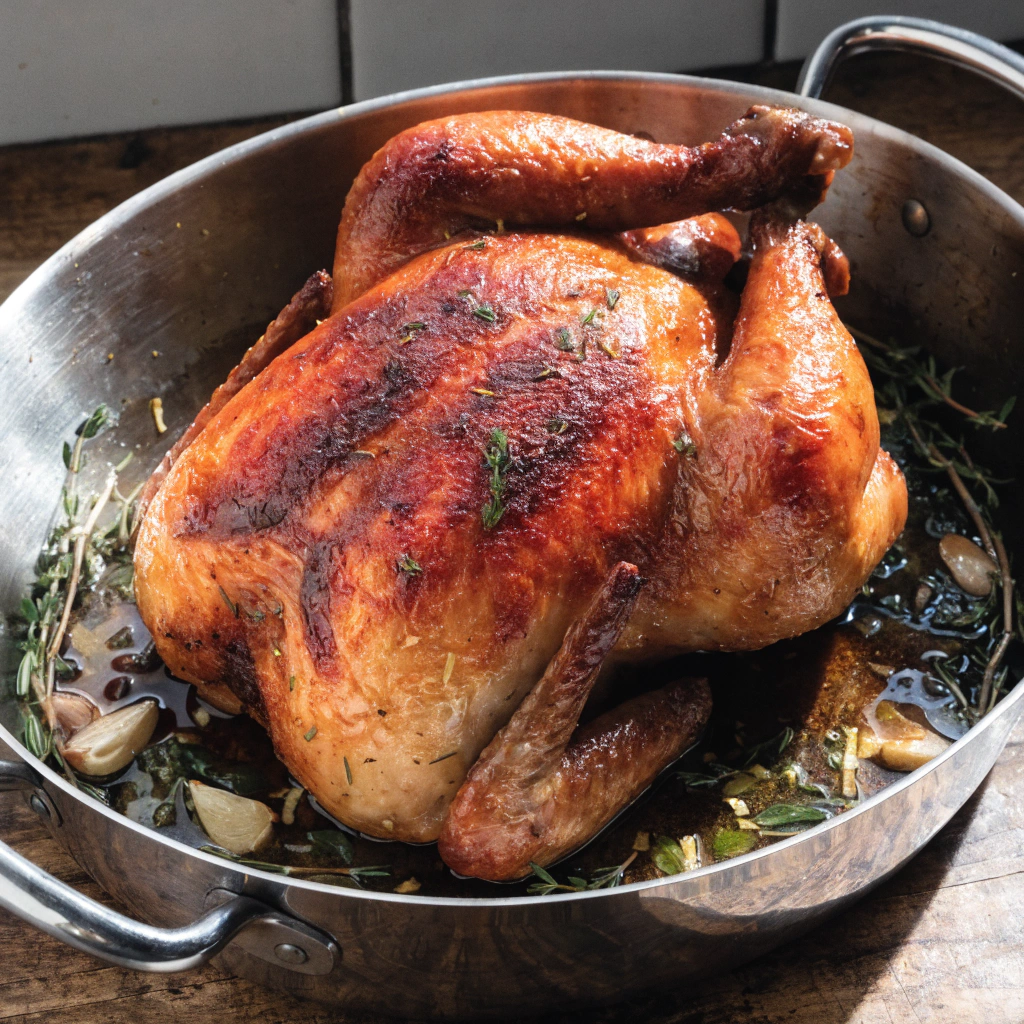 Roast at 425°F for about 45 minutes. Then baste the chicken with the pan juices using a spoon, baster, or silicone brush. Tip: Pull the chicken out of the oven to baste — it’s easier and helps keep the oven hot. Continue roasting for another 20–25 minutes, until the chicken is golden brown. To check doneness, cut between the leg and thigh — if the juices run clear, it’s ready. If the skin is browning too quickly, tent the chicken loosely with foil. If using a thermometer, the thickest part of the chicken should reach 160°F. Carryover cooking will bring it up to the recommended 165°F